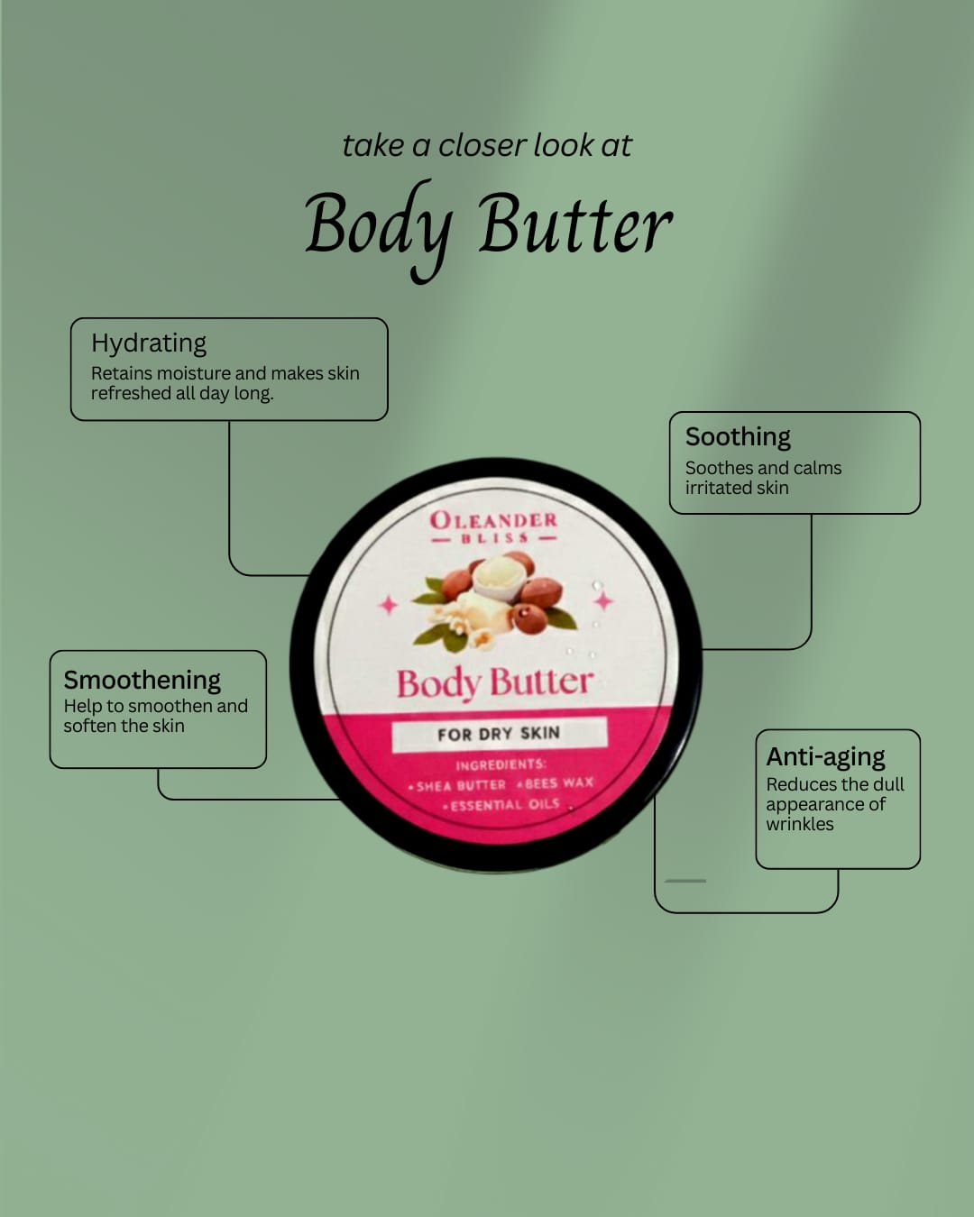 Shea butter deeply moisturizes, soothes skin conditions used in this body butter